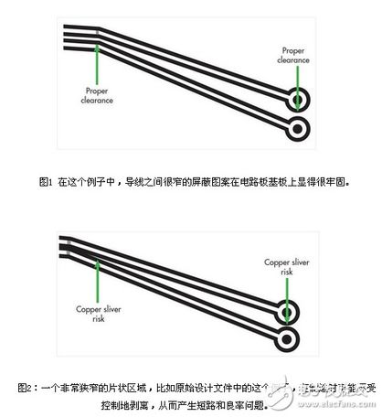 碎片是一种制造问题,可以通过正确的pcb设计得到最好的管理(图1)。为了理解碎片问题,首先需要回顾一下化学蚀刻工艺。化学蚀刻工艺的目的是要溶解掉不需要的铜。但如果有特别长、薄、条状的碎片需要腐蚀,这些碎片有时会在完全溶解之前整块脱离。这种条块随后飘浮在化学溶液中,有可能随机落在另一块pcb上。