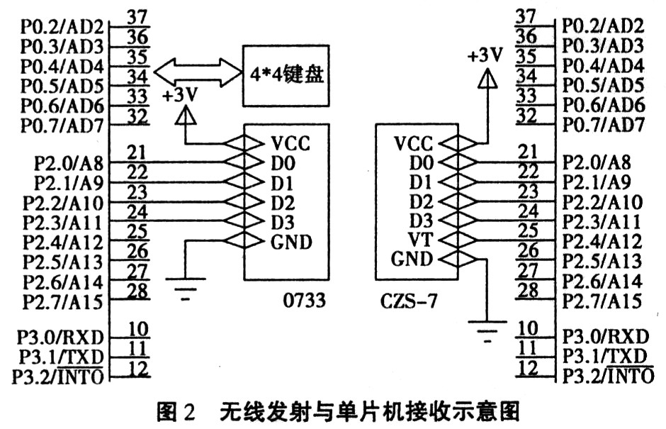 该设计中无线发射接受芯片采用的是SZSAW系列的0733编码发射芯片和CZS-7接收解码芯片,它的工作方式为频移键控FSK,因此发射信号比较稳定。0733发射芯片有四位数据端,CZS-7接收芯片除了四位数据端外还有一端为判断位VT端,当VT为l时表明没接受到信号,反之则接收到信号。芯片数据端的默认状态均为低电平。