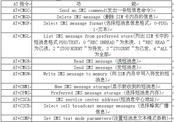 GSM引擎模块提供的命令符合GSM07.05和GSM07.07规范。GSM07.07中定义的AT Command接口,提供了一种移动平台与数据终端设备之间的通用接口;GSM07.05对短消息作了详细的规定。在短消息模块收到网络发来的短消息时,能够通过串口发送指示信息,数据终端设备可以向GSM模块发送各种命令。与SMS有关的GSM AT指令如表一所示。GSM AT指令集,是由诺基亚、爱立信、摩托罗拉和HP等厂家共同为GSM系统研制的,其中包含了对SMS(Short Message Service)的控制。