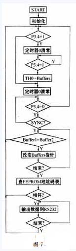 当输入信号为“1”时,定时/计数器0开始计数,并将定时/计数器0的高八位存入内存缓冲区中。当输入信号为“0”时,定时/计数器0也进行计数,同时判断是否有大于8倍的内存缓冲区中的值。如不满足条件,则继续采集脉冲信号,否则对24个内存缓冲区中的数据进行处理。