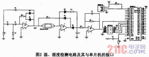 本系统采用DS18820作为温度检测元件,湿敏电阻作为湿度检测元件。这两种元件与单片机接口电路如图2所示。