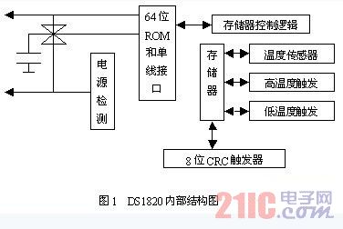DS1820的工作原理是:DS1820采用3脚PR-35封装或8脚SOIC封装,其中 GND为地;I/O为数据输入/输出端(即单线总线),该脚为漏极开路输出,常态下呈高电平;VDD是外部+5V电源端,不用时应接地;NC为空脚。图1所示为DS1820的内部框图,它主要包括寄生电源、温度传感器、64位激光ROM单线接口、存放中间数据的高速暂存器(内含便笺式RAM),用于存储用户设定的温度上下限值的TH和TL解发器存储与控制逻辑、8位循环冗余校验码(CRC)发生器等七部分。
