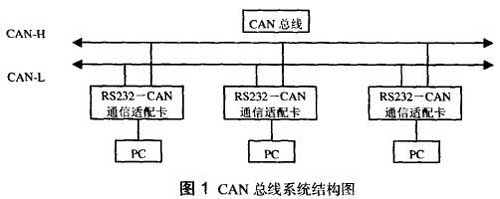 本实验通信网络通过CAN总线传输数据,设计的CAN-RS-232通信适配卡,可挂接在通信网络的任一节点位置,对于通过RS-232总线连入CAN网络的PC,可用WINDOWS自带的超级终端或者我们用VC编写的串口操作程序来接收和发送数据,可以实现点对点,及一点对多点的通信,实现CAN协议里的数据帧和远程请求帧的传送所谓远程请求帧就是接收端通过发送远程帧启动其资源节点传送它们各自的数据,板卡还可实现10位精度的A/D转换并将得到的数据通过CAN总线上传给上位机CAN总线系统结构如图1所示: