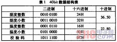 DHT11数字温湿度传感器采用单线双向的串行接口技术,一次通讯时间约4ms,数据分小数部分和整数部分,一次完整的数据传输为40bit,高位在先。即8bit湿度整数数据+8bit湿度小数数据+8bit温度整数数据+8bit温度小数数据+8bit校验码,其中校验数据等于上述4个8bit数据之和所得结果的末8位。例如:读取数据为:湿度为:36.50%;温度为22.80℃,则对应的40bit数据为:0010 0100,0011 0010,0001 O110,0101 0000,1011 1100,其数值对应于温湿度如表1所示。