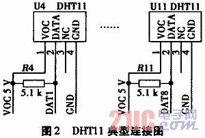 DHT11数字温湿度传感器,是一款含有已校准数字信号输出的温湿度复合传感器。测量范围相对湿度20%~90%RH,摄氏温度0~50℃。传感器包括一个电阻式感湿元件和一个NTC测温元件,并与一个高性能8位单片机相连接。数据接口采用单线制串行接口,信号传输距离可达20 m以上。传感器典型连接方式如图2所示,电源正与地跟单片机电源正和地相连接,8路数据接口分别接5.1 k上拉电阻与单片机P1口连接。