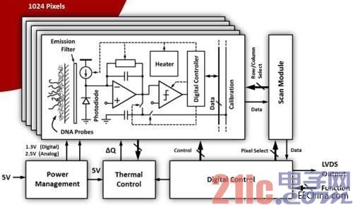 个别的数组元素由光电二极管和加热器组成,以刺激化学反应。该芯片利用5W功率加热。