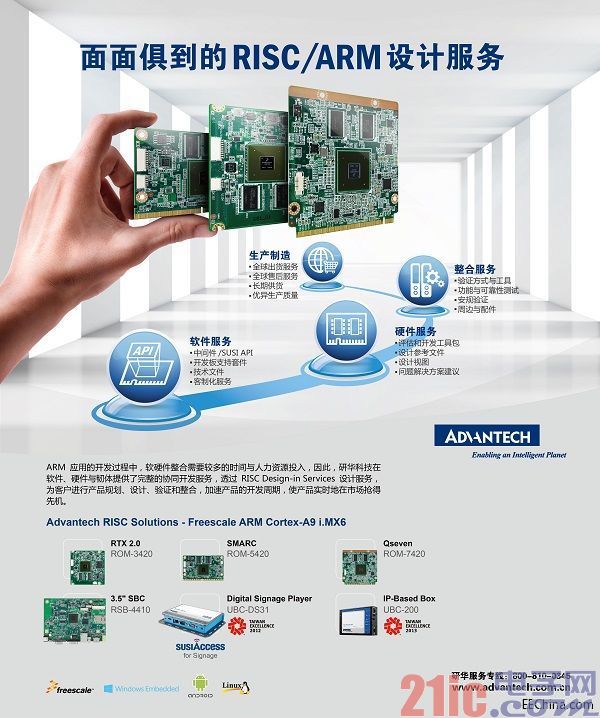 除了龙芯的产品,还有搭载飞思卡尔i.MX6处理器RISC计算平台展示。胡智生介绍说,应工业市场的需求,研华推出了全系嵌入式RISC/ARM平台解决方案。该解决方案包括ROM-3420 RTX2.0模块、ROM-5420 SMARC模块、ROM-7420 Qseven模块、RSB-4410适合多媒体应用的3.5"全功能单板电脑、UBC-DS31 RISC全高清数字标牌工控机和UBC-200网络网关工控机。