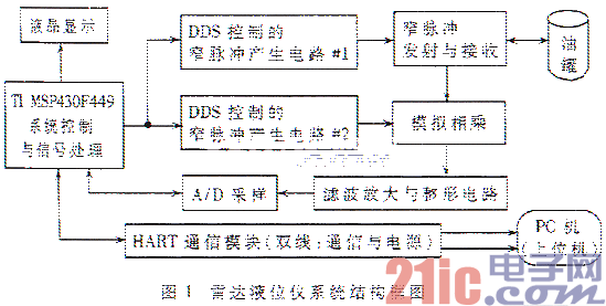 TI公司的MSP430系列单片机就顺应了这些发展趋势。它的低功耗特点使之特点适用于电池供电设备或手持设备中。该系列单处机还将大量的外围模块整合到片内,所以也适合构成较完整的片上系统。其丰富的型号给设计者选择带来了很大的灵活性。MSP430系列采用16位精简指令架构,有大量工作寄存器和数据存储器(MSP430F449含有最多的2KB的RAM),可以说,MSP430系列单片机凭借这些杰出的性能特点,已成为众多单片机中耀眼的新星。 雷达液位仪是雷达技术应用于民用领域的典型例子,它用于石油工业等行业里高压储罐的液位测量中。国外公司开发的产品价格昂贵,而国内的相关研究结果还不能令人满意。所以研制高性能、智能化的雷达液位仪,对我国石油工业液位测量仪器的更新具有重要意义。 为达到本质安全的工业标准,研制的雷达液侠仪对系统提出了极为严格的要求,其功耗必须低于70mW,同时精度要求达到%26;#177;5mm。这给 MSP430系列单片机提供了发挥特长的机会。通过选用这个系列产品中最高端的MSP430F449,充分利用其低功耗、高性能、丰富的片上外设等特点搭建系统平台,再加上采用特殊的系统控制和信号处理机制,非常好地实现了系统指标要求。