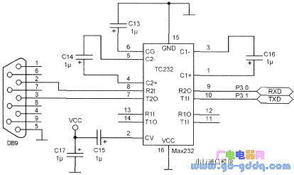 DB9的5端为公共端接地端,2、3端则分别连接信号的接收端和发送端,该电路完成TTL电平与RS232电平转换,DB9接口通过交叉串口线连接到PC机上,完成硬件的串行通信。