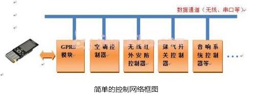 在嵌入式智能家居系统中,具有代表性的节点是“GPRS模块” 、“空调控制器” 、“煤气开关控制器”、“音响系统控制器”和“红外安全控制器”。如下图所示,通过空调控制器,可以对空调的开关进行直接控制;通过煤气开关控制器,可以对煤气的开关直接控制;通过音响系统控制器,可以对音响开关进行直接控制;通过无线红外安防控制器,可以进行防盗监控;通过GPRS模块,可以实现对空调的远程开关、对煤气开关的远程控制和查询、对音响系统的远程开关和防盗安全的远程报警。