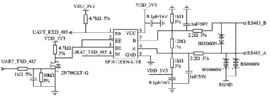 图1所示为硬件控制RS485的电路图。电路中使用2N7002LT1G MOS场效晶体管把UART_TXD_485这个MCU输出的RS485发送信号逻辑取反后送给RS485芯片的RE/DEPIN脚。控制的原理是,当UART_TXD_485输出低电平时RS485芯片的DE使能;输出高电平时RE使能。默认情况下UART_TXD_485是高电平,RS485芯片处于接收状态。发送数据时,UART_TXD_485上面有高低电平信号变化,低电平信号通过RS485芯片SP3072EENL/TR直接输出,高电平信号通过外部上下拉电阻来控制。
