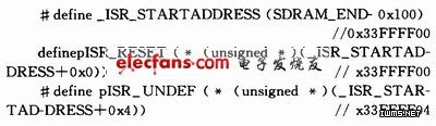 如果有中断或者异常发生时,处理器便会强制性地把PC指针指向向量表中它所对应的中断类型地址值。为了提高中断响应速度,FLASH的0x0地址存放能跳转到0x33FFFF00地址处中断向量的跳转指令,也就是会在在RAM中建立一个二级中断向量表,起始地址为0x33FFFF00。除了复位外,所有的异常入口地址都由FLASH跳转得到,代码如下: