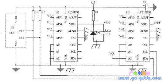 以AT89C51为主器件.I2C总线上连接4个PCF8591芯片,芯片地址分别为(OOOb、OlOb、020b、400b),89C51的P3.6作为SCL信号.P3.7做为SDA信号,每个芯片的模拟输入采用单端方式输入,参考电压VREF选用4.