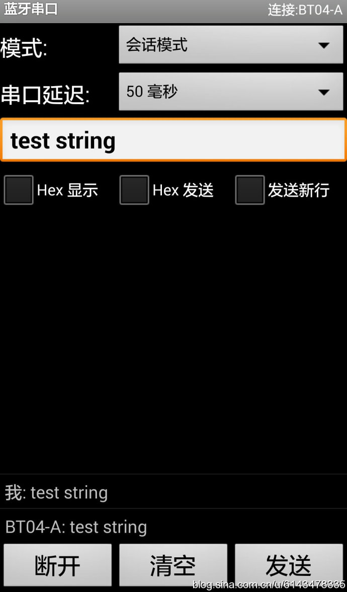 将上面程序编译,下载到STM8S单片机上,先用智能手机与蓝牙模块配对,然后用蓝牙串口调试的APP(这类工具APP比较多,这里用的是叫“蓝牙串口”的APP)与已经配对的蓝牙模块连接上,最后发送数据(发送"test string"),可以看到单片机已经收到了数据,并原样发送回来了。