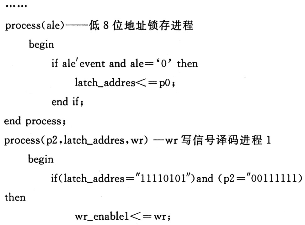 在接口设计中,采用了VHDL语言实现其接口逻辑。用VHDL语言编写,往往比较方便和严谨,注意整个过程的逻辑思路,并且尽量避免语言的冗余,造成比较长的延时。-MCS-51单片机与FPGA的通信读写电路的部分程序