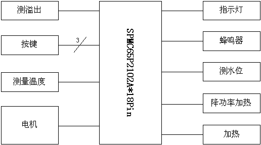 硬件组成框图如3-1所示,3个传感器分别测量水位、溢出、温度,3个按键,1个蜂鸣器输出口,2种加热方式选择。