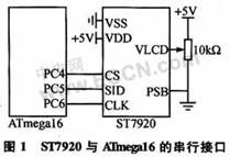 以ST7920为控制器的YM12864R点阵式液晶显示模块和单片机之间的接口方式有并行和串行两种。本文采用串行接口方式,单片机选用AVR公司的ATmega16。接口电路如图1所示。其中,PC4控制串行的片选信号(CS),低电平有效;PC5控制串行的数据线(SID);PC6控制串行的时钟输入(CLK)。ST7920通过VCC(+5 V)和GND之间串联一个10 kΩ的电阻来控制背光强度。如果不需要调节对比度,可以直接将VLCD引脚接VCC(+5 V),此时对比度最大。