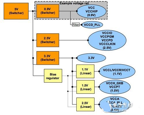 在FPGA电源设计过程的下一步骤是确定是否一个特定的轨道应该由一个开关调节器或线性调节器提供动力。特别需要注意的是针对提供噪声敏感的电路,如PLL和收发器电路的模拟电源轨。这些轨噪声过大可能会危及电路的性能。