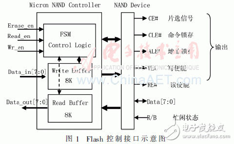 NAND Flash芯片是通过异步高性能I/O与主控芯片通信的,8位复用总线传输操作指令、操作地址以及数据,多个控制信号来区分总线接口状态以及获取芯片工作状态,如图1。