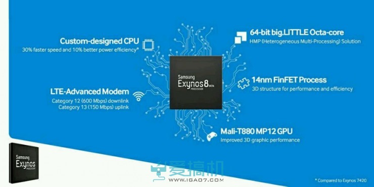 官宣Exynos 8890比7420性能提升30%,效能比提升10%。注意,官方原文是power efficiency(能源效率)而不是功耗,考虑到性能的提升,CPU部分的实际功耗应该会比7420更高。