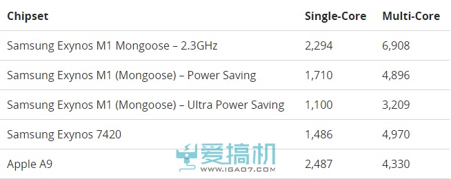 配合此前网上曝光的Geekbench跑分信息,Exynos 8890(即Exynos M1)在预设频率2.3GHz下,单线程得分2294,多线程得分6908。和苹果A9相比,单线程弱1.1倍,多线程强1.57倍。维持了以前安卓平台单核弱,多核强的局面。