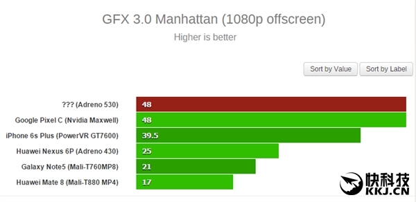 GPU性能更加逆天了,Manhattan 3.0跑出了惊人的48FPS,不但完秒iPhone 6S,还追平了Google Pixel C平板机里的NVIDIA麦克斯韦架构Tegra X1,后者可是有256个流处理器。