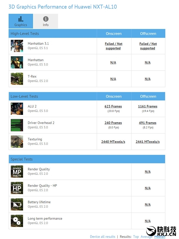 经过查询,该设备型号为NXT-AL10,很有可能就是即将要发布的Mate 8。从GFXBench提供的信息可以看到,该机采用了6寸1080p屏幕,搭载2.2GHz的麒麟950处理器(比之前猜测的2.4GHz要低一些),GPU部分为Mali-T880,但目前还不确定是MP几。
