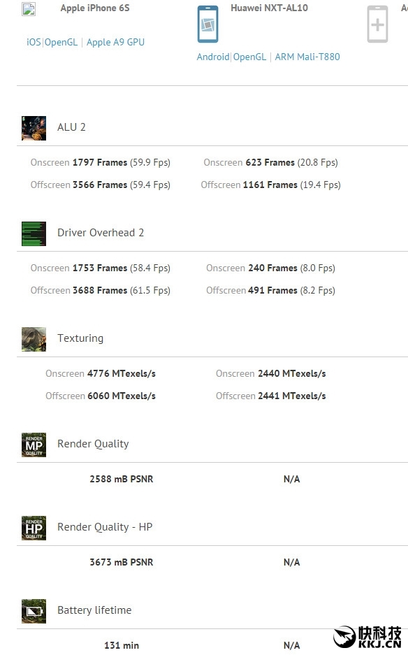 目前,该设备的GFXBench测试数据并不完整,只有Low level部分,我们就那这部分和iPhone 6s A9 GPU、三星Galaxy S 6 edge+的Mali-T760 MP8简单的对比一下: