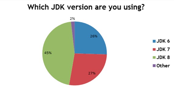 根据调查结果,一定数量的开发人员,约45%,已经升级到JDK 8;但是,超过50%的参与者仍然使用以前的版本工作。