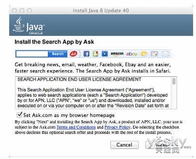 【天极软件频道消息】甲骨文(Oracle)上周发布Java 8 Update 40 for Mac,有用户发现甲骨文开始沿用于Windows平台上的策略--在Java的安装程序中内置第三方的Ask.com服务,将Mac OS X变成Java的广告平台。