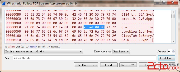 使用十六进制形式查看数据包,查找“ac ed 00 05”,可以找到对应的数据,可以确认抓包数据中包含JAVA序列化数据。