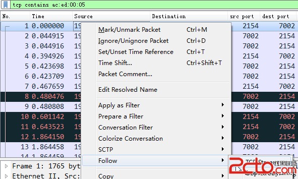 已知JAVA序列化数据的前4个字节为“AC ED 00 05”,使用“tcp contains ac:ed:00:05”条件过滤出包含JAVA序列化数据的数据包,并在第一条数据包点击右键选择“Follow TCP Stream”,如下图。