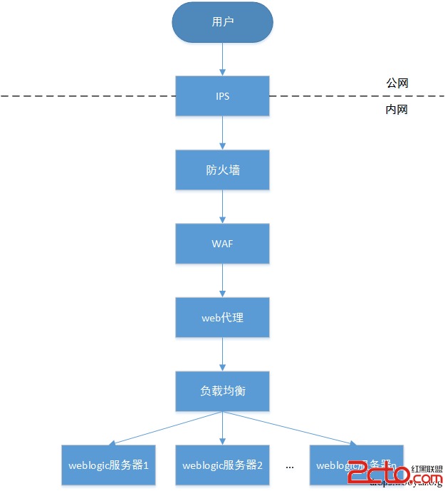 对安全有一定要求的公司,在部署需要向公网用户提供服务的weblogic服务器时,可能选择下图的部署架构(内网中不同网络区域间的防火墙已省略)。