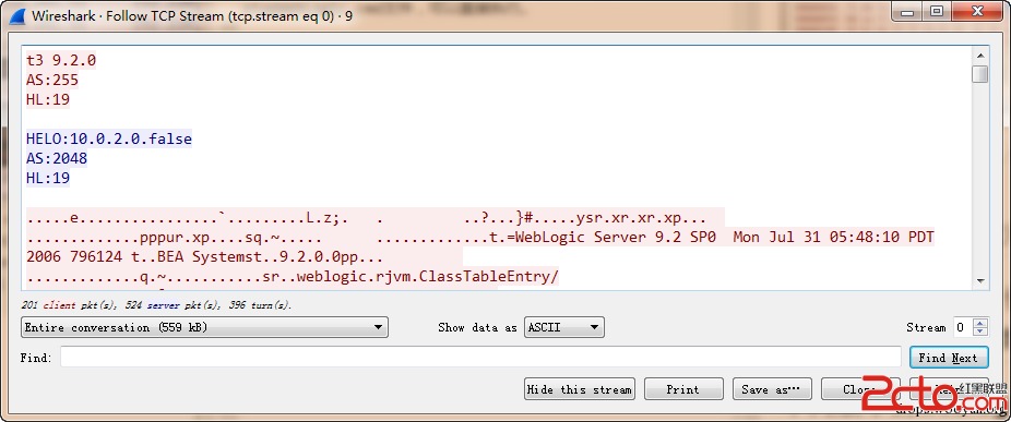 可以看到当weblogic客户端向weblogic服务器发送序列化数据时,发送的第一个包为T3协议头,本文测试时发送的T3协议头为“t3 9.2.0nAS:255nHL:19nn”,第一行为“t3”加weblogic客户端的版本号。weblogic服务器的返回数据为“HELO:10.0.2.0.falsenAS:2048nHL:19nn”,第一行为“HELO:”加weblogic服务器的版本号。weblogic客户端与服务器发送的数据均以“nn”结尾。