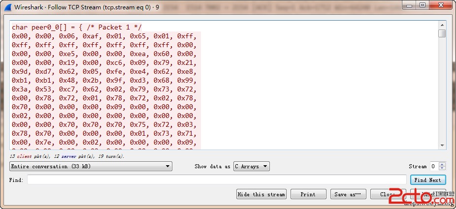 使用C数组形式查看第一个数据包,peer0_x数组为Packet 1,将peer0_x数组复制为一个C语言形式的数组,格式如“char peer0_0[] = { 0x01, 0x02 ...};”,将上述数据的“char”修改为“byte”,“0x”替换为“(byte)0x”,可以转换为能直接在JAVA代码中使用的形式,格式如“byte peer0_0[] = {(byte)0x00, (byte)0x02 ...}”。