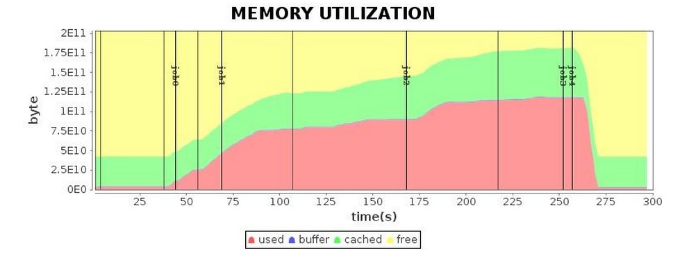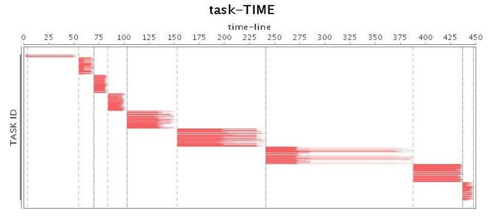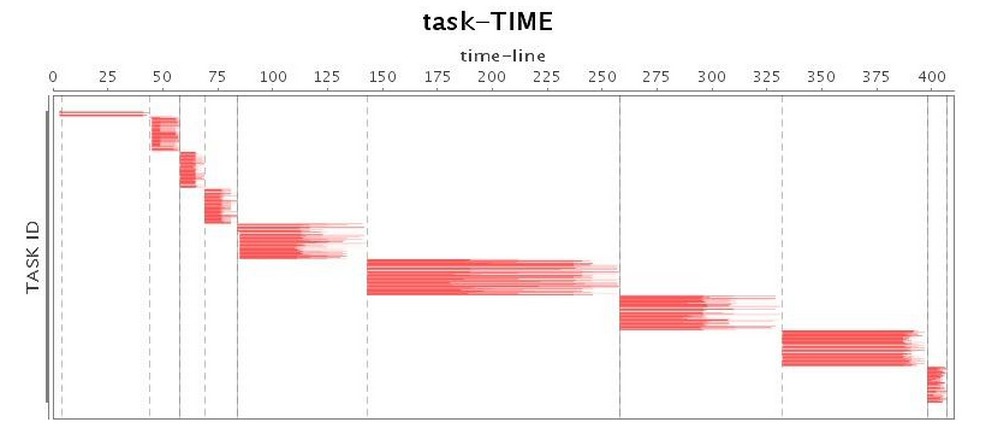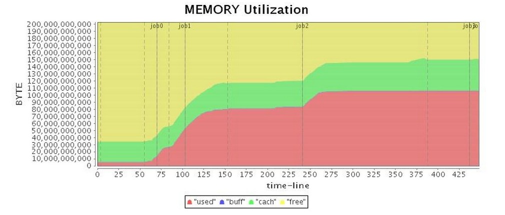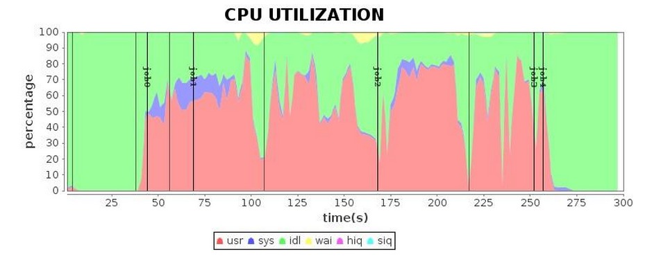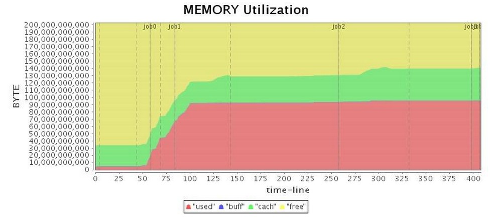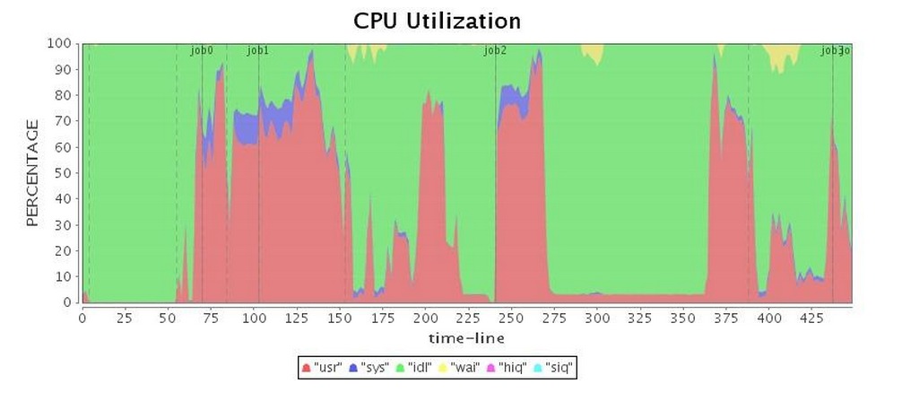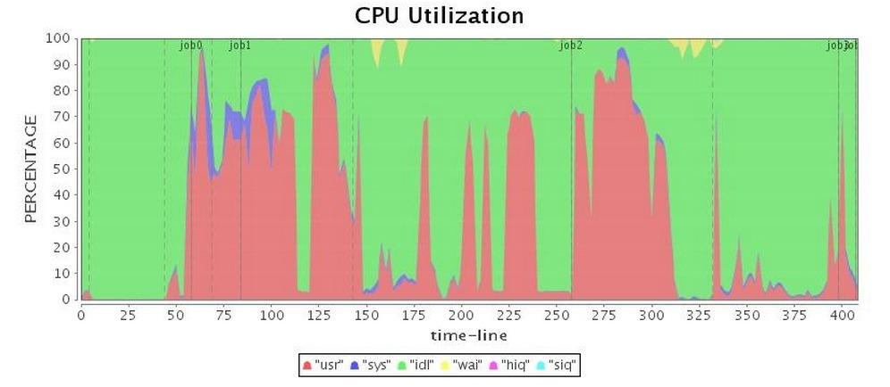 接下来,我们就使用最基本的G1 GC配置来运行我们的应用。实验结果发现,G1 GC竟然也出现了不可忍受的Full GC(表3的CPU利用率图中,可以明显发现Job 3中出现了将近100秒的暂停),超长的暂停时间大大拖累了整个应用的运行。如表4所示,虽然总的运行时间比Parallel GC略长,不过G1 GC表现略好于CMS GC。