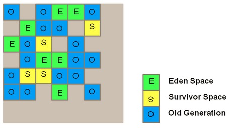在传统JVM内存管理中,我们把Heap空间分为Young/Old两个分区,Young分区又包括一个Eden和两个Survivor分区,如图1所示。新产生的对象首先会被存放在Eden区,而每次minor GC发生时,JVM一方面将Eden分区内存活的对象拷贝到一个空的Survivor分区,另一方面将另一个正在被使用的Survivor分区中的存活对象也拷贝到空的Survivor分区内。在此过程中,JVM始终保持一个Survivor分区处于全空的状态。一个对象在两个Survivor之间的拷贝到一定次数后,如果还是存活的,就将其拷入Old分区。当Old分区没有足够空间时,GC会停下所有程序线程,进行Full GC,即对Old区中的对象进行整理。这个所有线程都暂停的阶段被称为Stop-The-World(STW),也是大多数GC算法中对性能影响最大的部分。