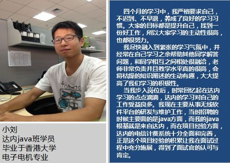 小刘说:“四个月的学习中,我严格要求自己,不迟到、不早退,养成了良好的学习习惯。大家的目标都是提升自己,找到一份好工作,所以大家学习的主动性很高,也都很努力。我尽快融入到紧张的学习气氛中,并经常在自己学习之余帮助其他同学解答问题,和同学相互之间相处很融洽,老师非常负责并且教学水平真的很高,会将枯燥的知识阐述的生动有趣,大大提高了我们学习的积极性。因为学得扎实,在毕业前夕,我就同时收到了几份offer,我最终选择了自己心仪的公司**朗讯。当我步入岗位后,时常回忆起在达内学习的点点滴滴,达内的学习对自己的工作受益良多。我现在主要从事无线软件平台的研发与维护工作,当时招聘的时候主要面的是java方面,而我的java根基就是来自达内,而在项目经验方面,达内的电信计费系统十分全面和完善,正是这个项目经验的积累让我在面试过程中充分施展,得到了面试官的认可与肯定。我觉得达内能够真正的提升自己的技术水平,无论是软件实力还是求职技巧等软实力,是求职过程中的一块镀金石。最后感谢自己的班主任老师和两位项目经理,以及各位任教的老师,正是老师们的督促使得我不懈怠。达内丰富的资源也会让我终生受用,选择达内太正确了!”