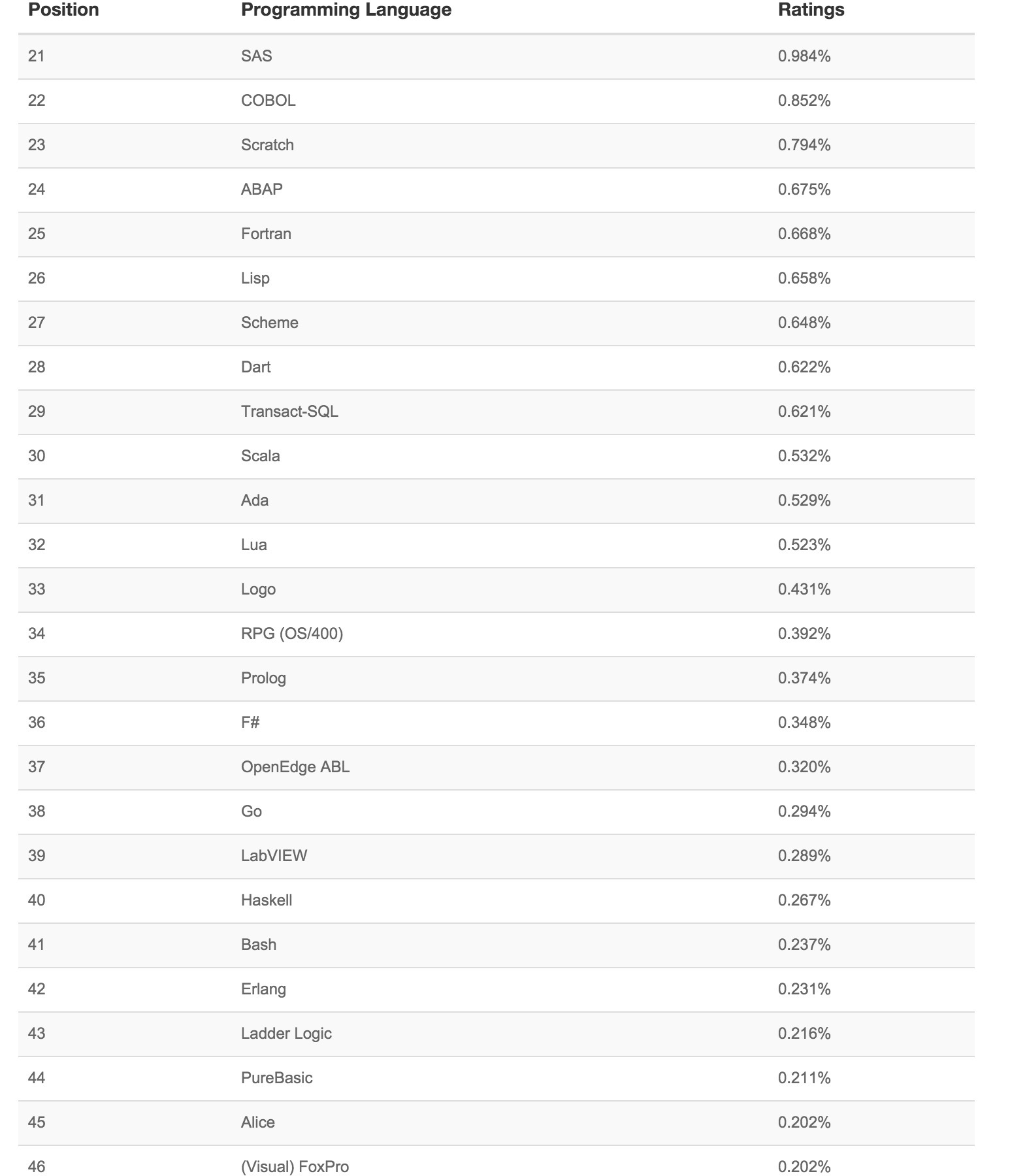 The following list of languages denotes #51 to #100. Since the differences are relatively small, the programming languages are only listed (in alphabetical order).