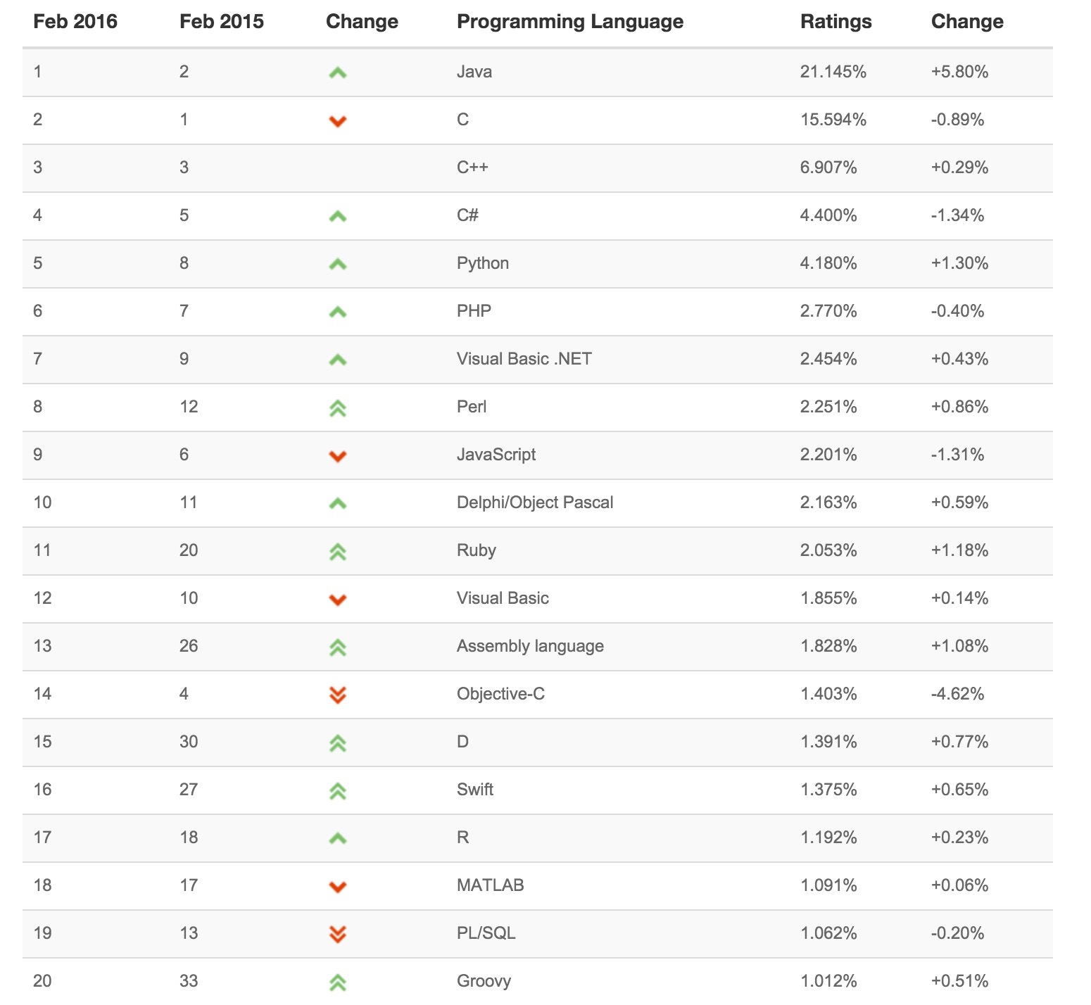 TIOBE 2016年2月编程语言排行榜 Java发展受阻