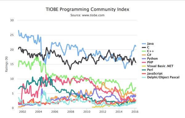 Java编程语言在2014年年底指数出现攀升,一直持续到上个月。Java在2015年TIOBE编程语言指数增长中显然有一些挣扎,并在2016年继续挣扎。这种增长不同于其它编程语言,如Python和C++出现的短期内增长。