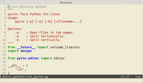 相信大家一定都知道Vim语言,而pyvim正是Vim在Python中的一个翻版或者叫克隆。这个编辑器完全采用Python开发(没有C扩展)。这使得开发变得快很多。它易于创建原型和集成新的特性。