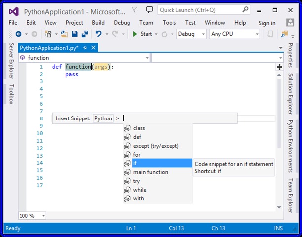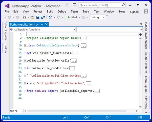 PTVS (Python Tools for Visual Studio) 是一个开源项目,采用Apache 2.0许可发布。PTVS的主要特性包括:CPython、IronPython、Jython和PyPy;高级编辑功能如IntelliSense;多 重构;内置REPL(read-eval-print loop)窗口;调试和分析功能,等等。