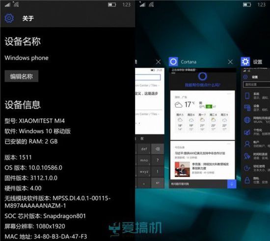 系统版本号是10.0.10586.0,属于Windows 10 移动版,我们体验的是小米手机4联通版,内存为2G,使用了高通骁龙801处理器,在Lumia 950/950XL上市前,它已经是我们能买得到的顶配Windows Phone手机。右图是长按返回实现的多任务管理。