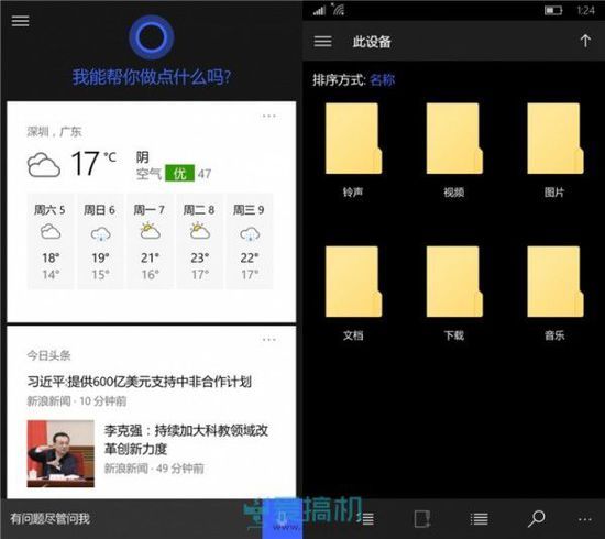 左图是按下搜索键(在小米4上是左侧的虚拟按键)实现的语音助手“小娜”,右图是自带的文件管理器。