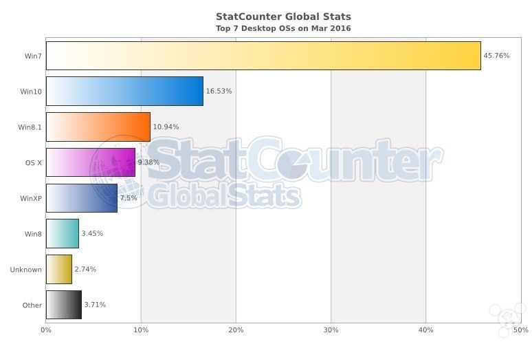 毫无疑问,每天 100 万的 Windows 10 装机量对微软而言绝对是好消息。不过,微软今天面临的最大挑战依然是自家的 Windows 7 操作系统。StatCounter 统计的数据显示,2016 年 3 月份 Windows 7 的市场份额仍高达 45.76%。