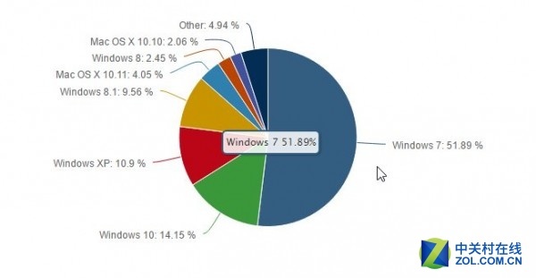 至于其他系统,Windows 8.1系统的份额已经下跌至9.55%,Windows XP也下跌到了10.90%,而OS X 10.11和10.10合计则有6.11%的份额。