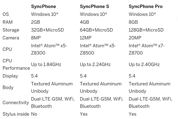 这三款Windows 10手机其实就是三个不同的配置,它们在外观上没有区别最低配的SyncPhone仅配备了2GB 内存,使用的CPU是X5-Z8300(4核心4线程,最高主频1.84GHz),中端的SyncPhone S配备了4GB内存,使用X5-Z8500(与小米平板2同款CPU),而最高配版的SyncPhone Pro配备了8GB内存,X7-Z8700,还有2000万像素摄像头,这样的配置已经秒杀了许多国内外旗舰机型,甚至还把很多Win10平板都给秒了。同时它还采用铝合金金属机身,支持双卡双待,还提供有一只手写笔,这配置简直了!!