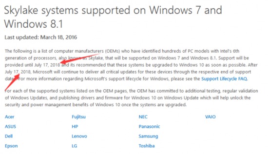 今年1月,微软宣布包括戴尔、惠普等在内100多款搭载英特尔第六代酷睿Skylake处理器的OEM设备将于2017年7月17日之前终止对Windows 7/8.1系统的支持,在此之后运行Skylake处理器的老版本Windows系统只能接受关键安全更新。而今天微软对Skylake支持策略进行调整,延长系统完全支持寿命周期至2018年7月17日,延长1年时间。