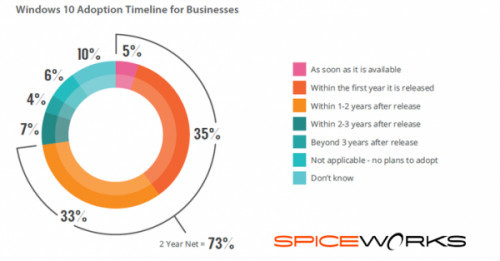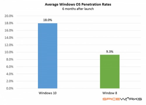 Spiceworks公司的数据显示,Windows 7达到2亿台的数字用时1年时间,Windows 8用时15个多月,Windows 10达成同样的壮举只耗时6个月时间。此外,Windows 8发布6个月之后在商业环境当中的普及率仅为9.3%,Windows 10现在在商业环境当中的普及率几乎是Windows 8的2倍。